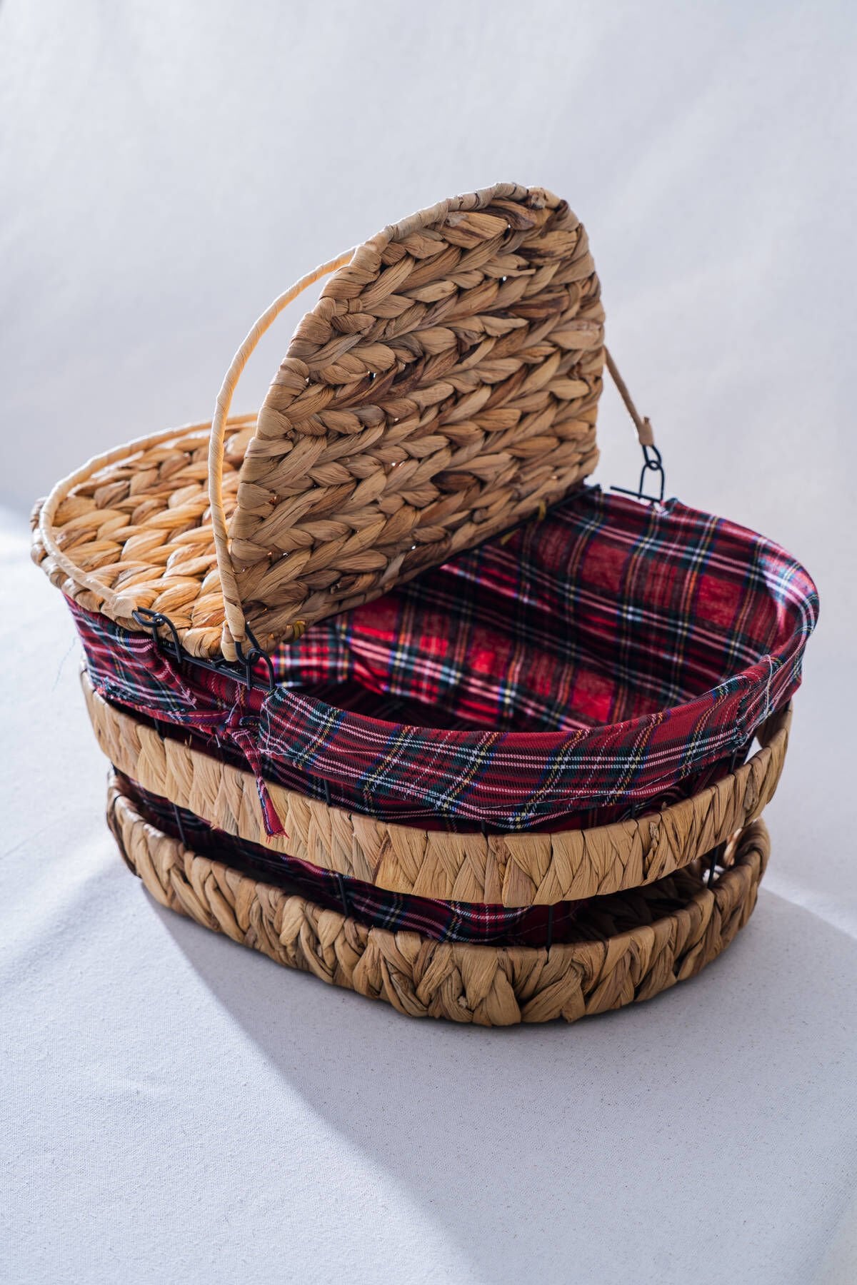 Doğal örgü hasır piknik sepeti, geleneksel görünümünü modern konforla buluşturuyor. Kırmızı ekose kumaş astarı ve sağlam kapak yapısıyla içeriklerinizi güvenle taşımanızı sağlarken, çift kulplu taşıma sapı sayesinde kolayca taşınabilir.
